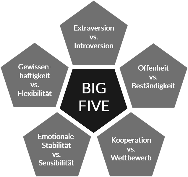 Auf jeder der Dimensionen neigt eine Person mehr oder weniger stark zu einem der beiden entgegengesetzten Pole. Das Gesamtresultat dieser Neigungen bildet das individuelle Persönlichkeitsprofil nach dem Big Five Modell.